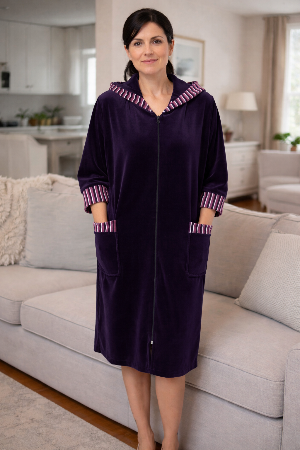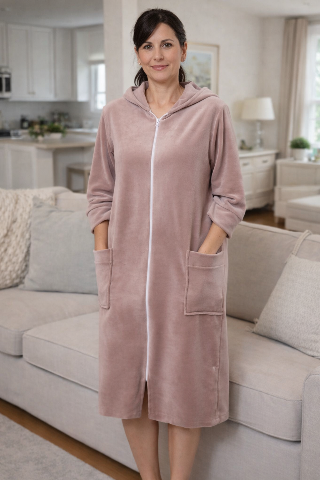Велюровий халат на бавовняній основі (44–80)Комфортний велюровий халат на бавовняній основі — ідеальний вибір для дому та відпочинку. М’який, приємний до тіла матеріал добре пропускає повітря, не парить і зберігає форму після прання. Вільний крій забезпечує зручну посадку на будь-який тип фігури, а продуманий фасон підкреслює силует без обмеження рухів. Халат чудово підходить як для щоденного використання, так і для відпочинку вдома. Характеристики: