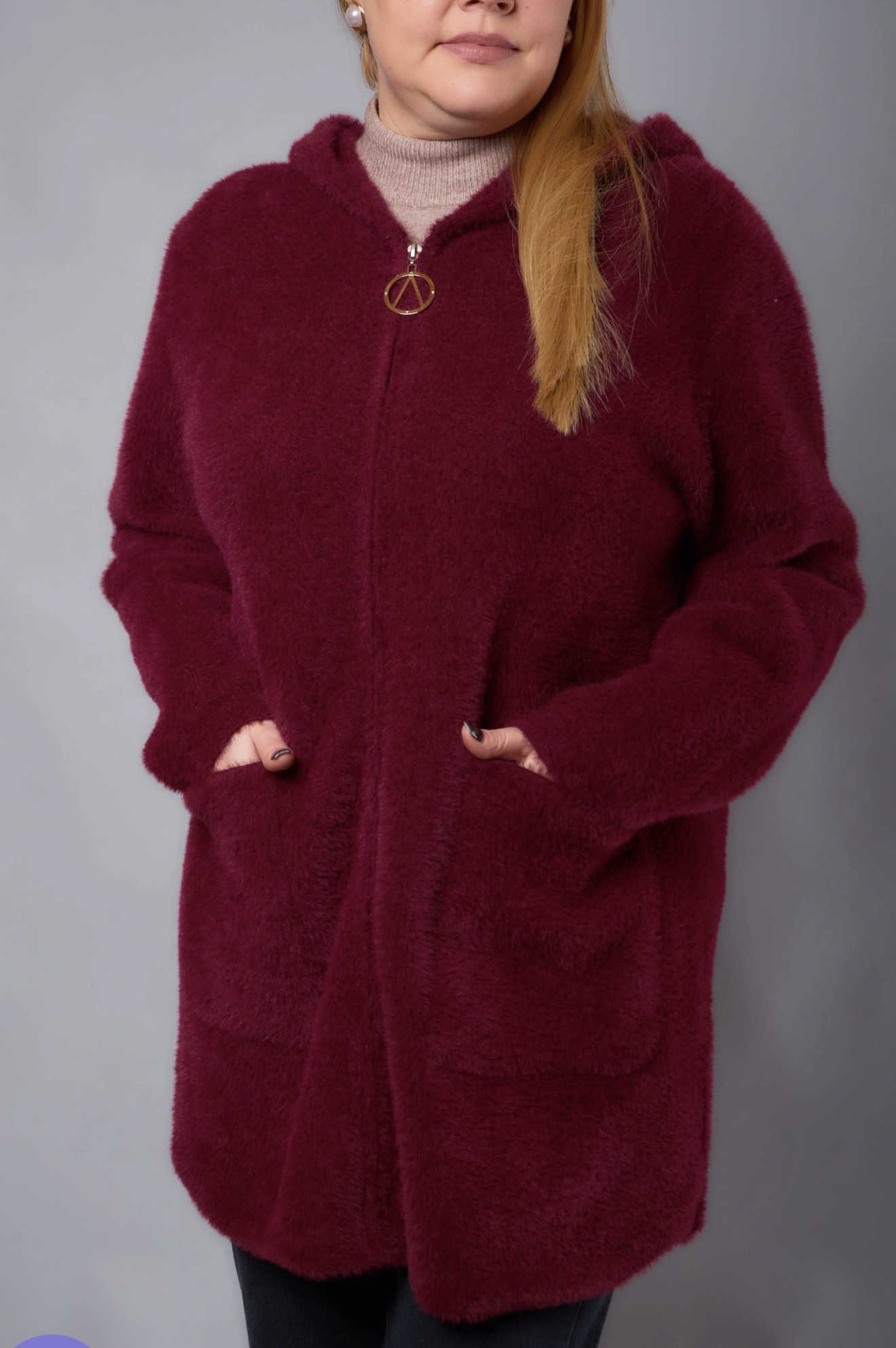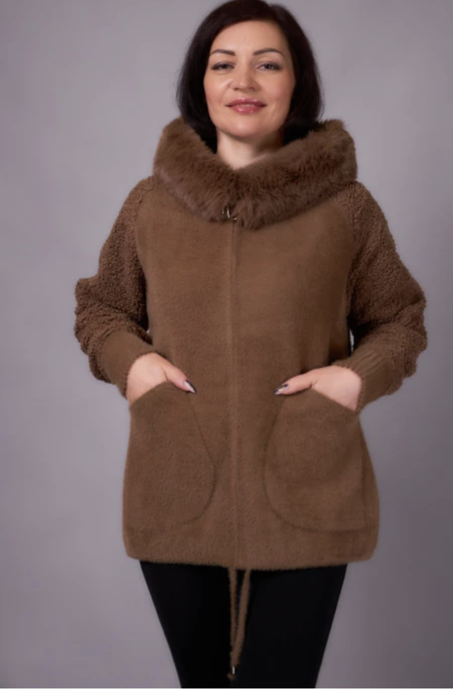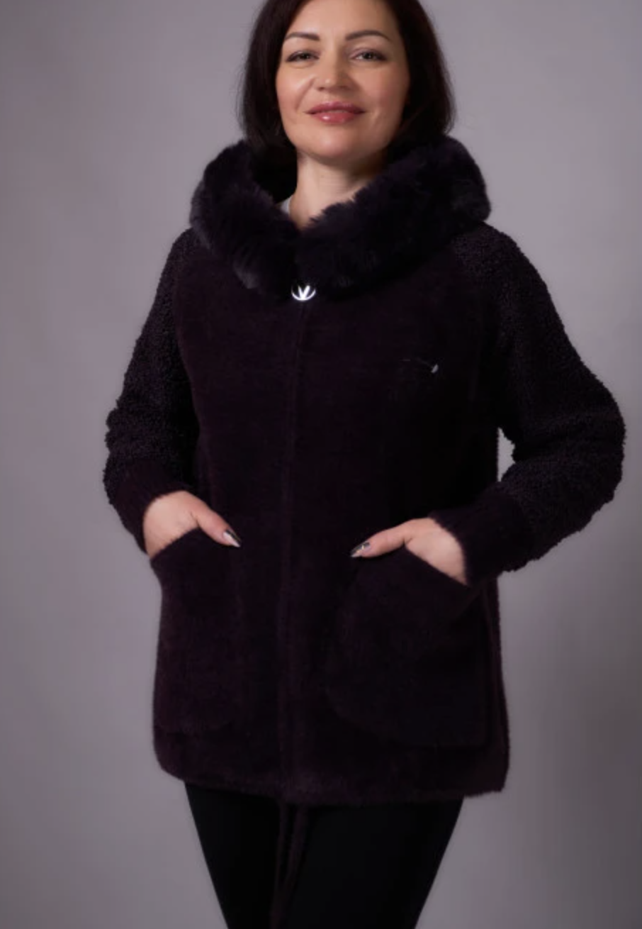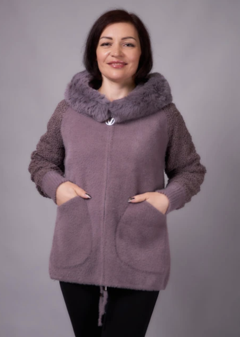 Теплий кардиган з капюшоном та м’якою хутряною окантовкою. Прямий вільний крій, застібка на блискавку, зручні накладні кишені. Комфортний і стильний варіант на кожен день. Розміри 46–66.