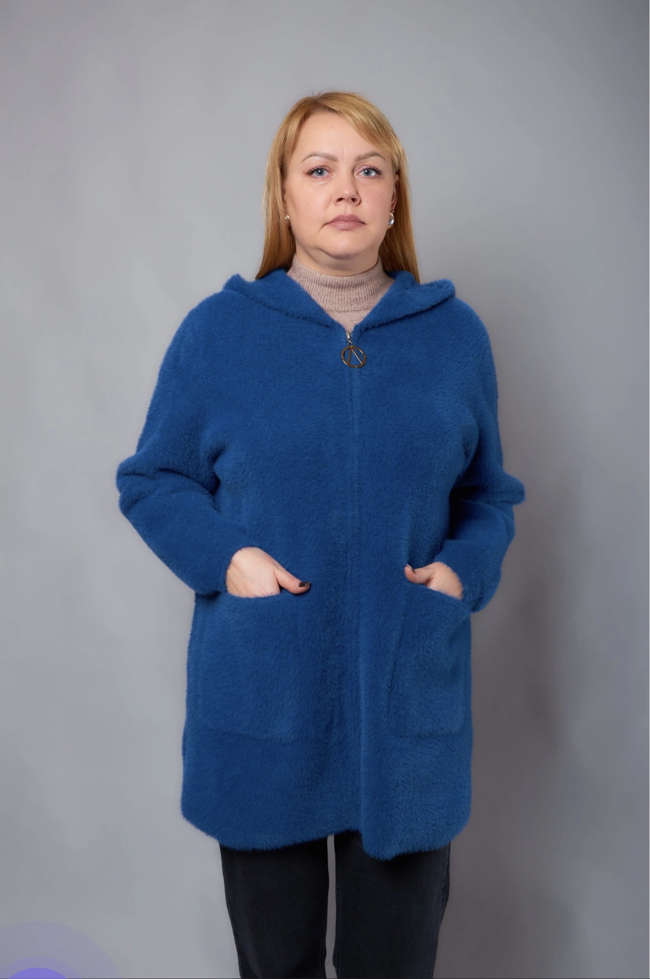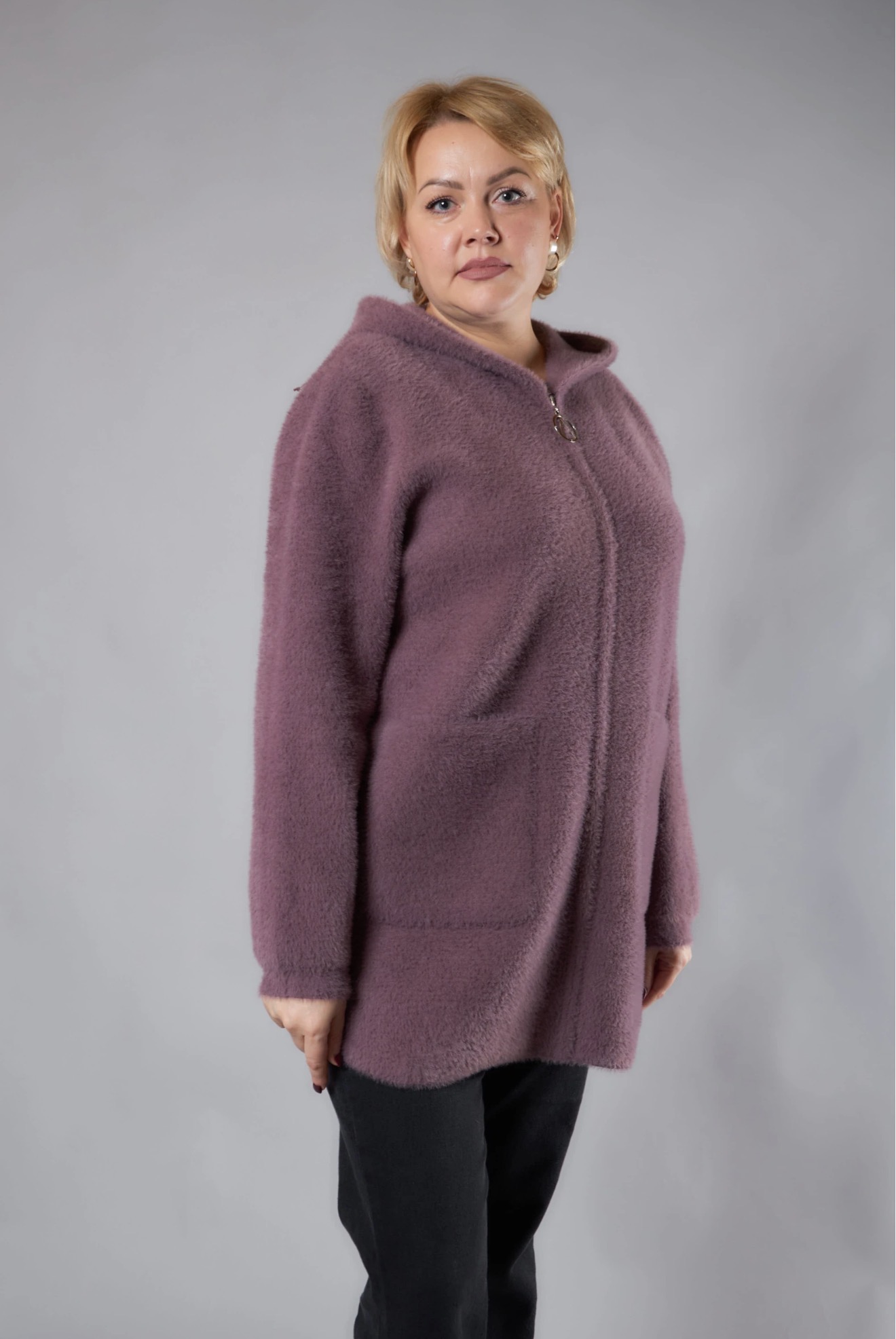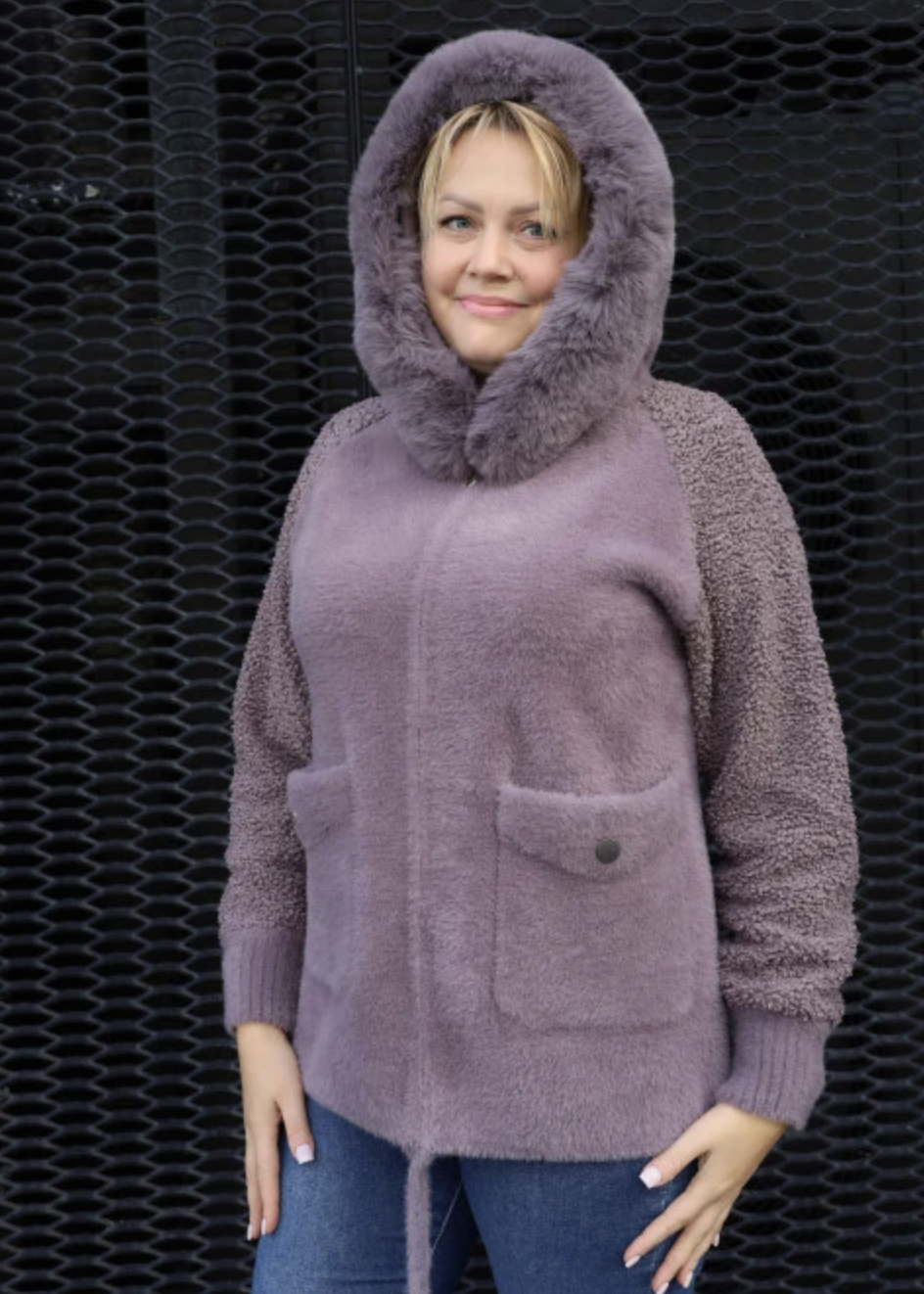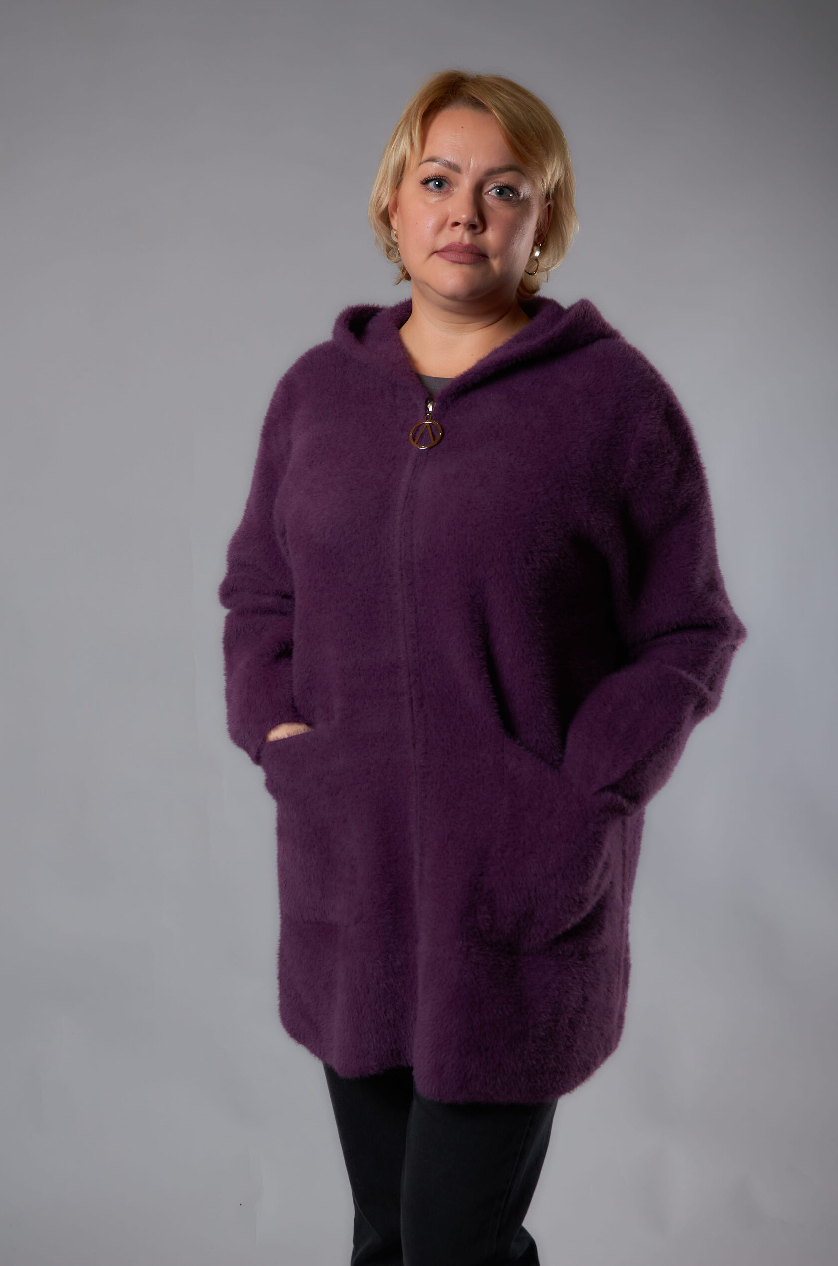 Теплий кардиган з капюшоном та м’якою хутряною окантовкою. Прямий вільний крій, застібка на блискавку, зручні накладні кишені. Комфортний і стильний варіант на кожен день. Розміри 46–66.
