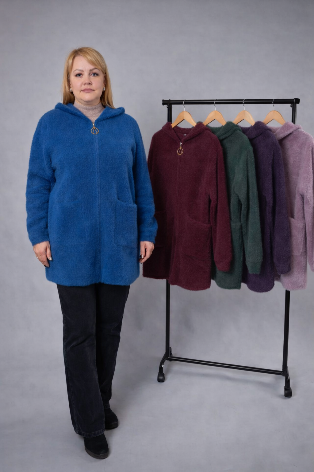 Кардиган з капюшоном, розміри 48–62 Стильний та комфортний кардиган вільного крою, створений для щоденного комфорту та елегантного образу. Модель виконана з м’якого, приємного на дотик ворсистого матеріалу, який добре тримає форму та дарує відчуття затишку. Особливості моделі: